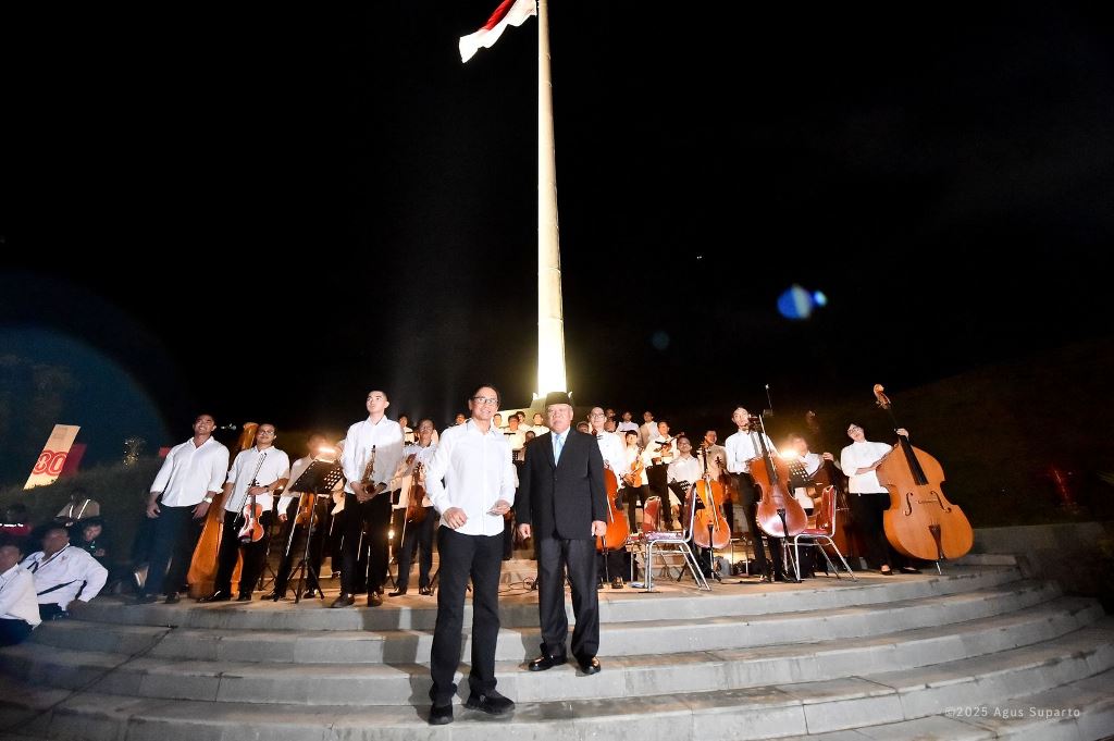 Kepala Otorita IKN, Basuki Hadimuljono, bersama seluruh pemusik Twilite Orchestra dipimpin oleh Addie MS yang turut menambah kekhidmatan Apel. (FOTO: Humas IKN)