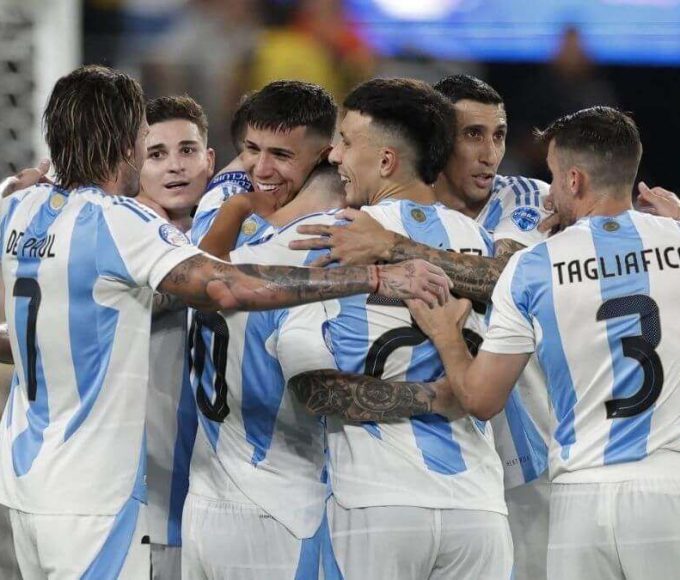 Para pemain Timnas Argentina merayakan gol ke gawang Kanada pada laga semifinal Copa America 2024 di MetLive Stadium, Karolina Utara, Rabu (10/7/2024) pagi...