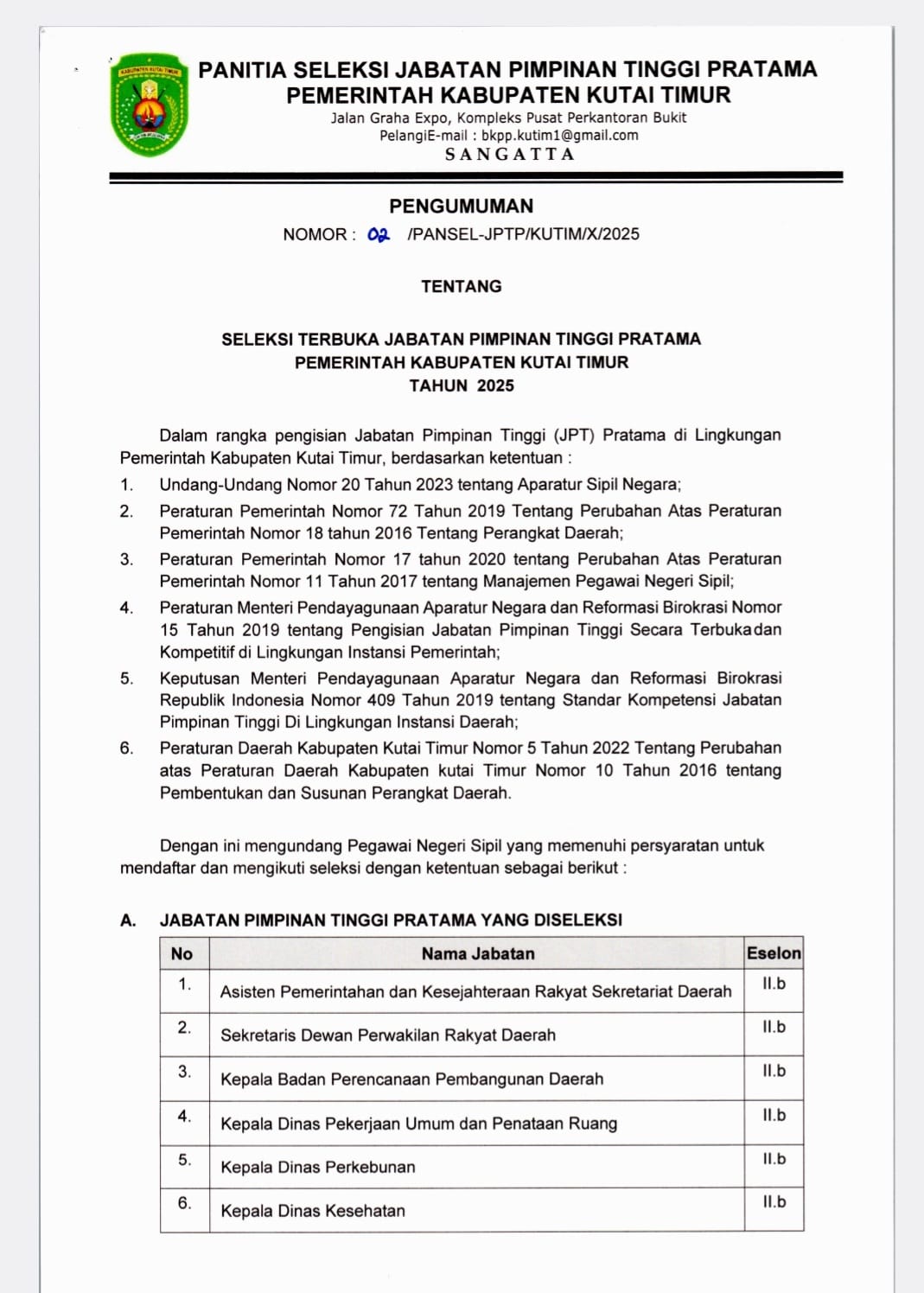 Pengumuman resmi dibacakan oleh Panitia Seleksi (Pansel) pada Jumat (10/10/2025). Pendaftaran dibuka mulai 13 hingga 27 Oktober 2025 dan dapat dilakukan secara langsung di Sekretariat Pansel yang berlokasi di kantor Badan Kepegawaian dan Pengembangan Sumber Daya Manusia (BKPSDM) Kutim, Jalan Graha Expo, Bukit Pelangi, Sangatta Utara, maupun secara daring melalui tautan https://bit.ly/selterJPTPratamakutim2025.