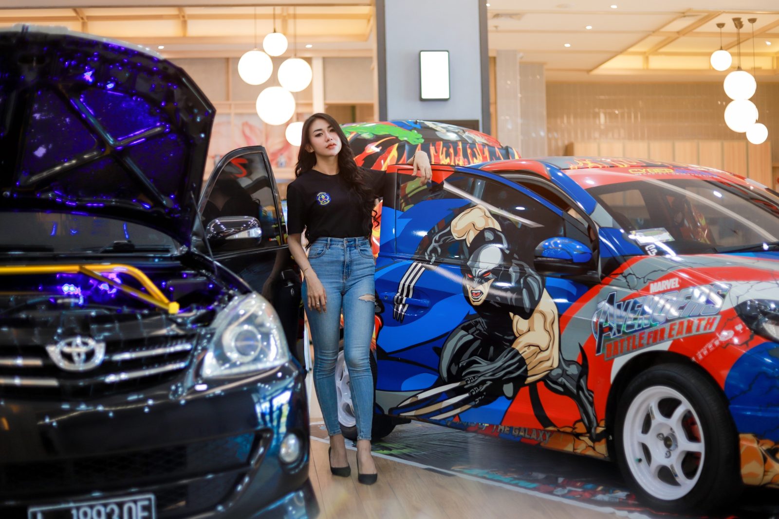 Model berfoto di samping deretan mobil yang sudah dimodifikasi dalam acara Bontang Auto Meet Up and Contest 2024 yang bertempat di halaman parkir Citimall, Minggu (21/4/2024). Puluhan mobil yang dimodifikasi diikutsertakan dalam kontes tersebut, mulai dari 20 sampai 21 April 2024.