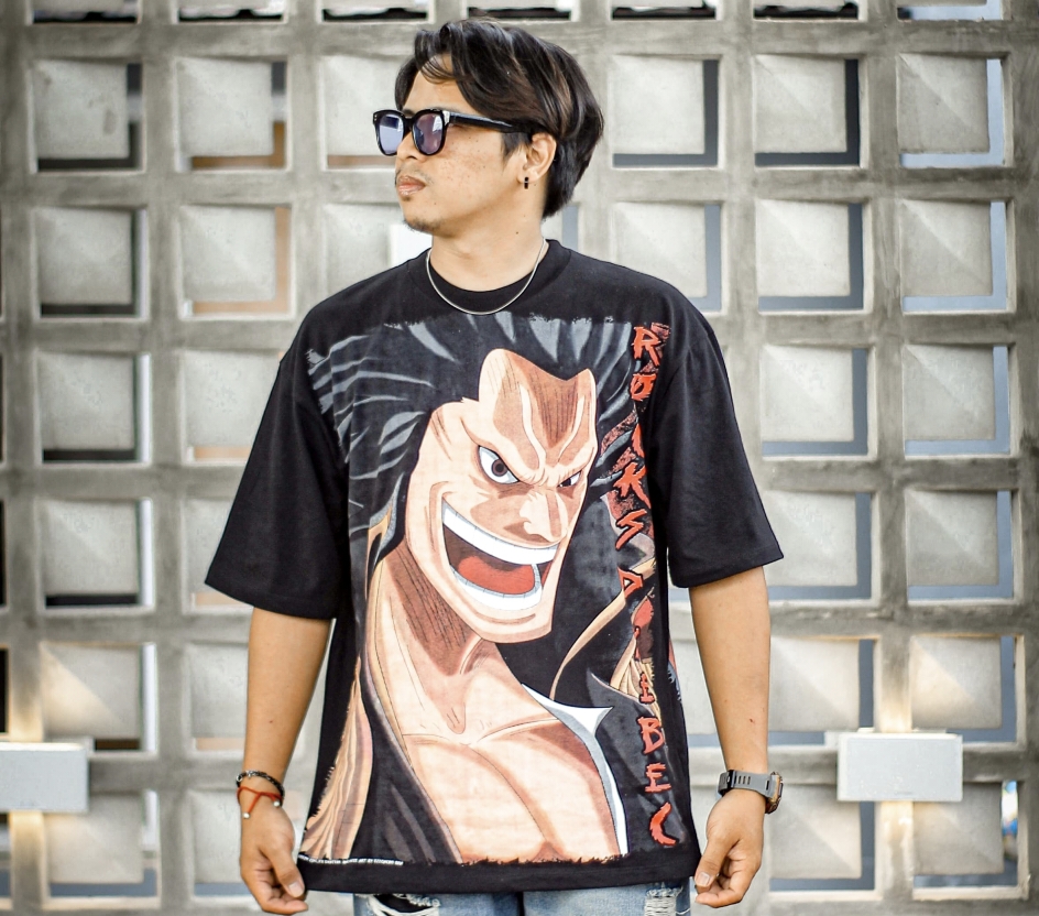 Arya mengenakan salah satu kaos Odah Etam dengan art print dari anime One Piece (FOTO: Doc. Pribadi)