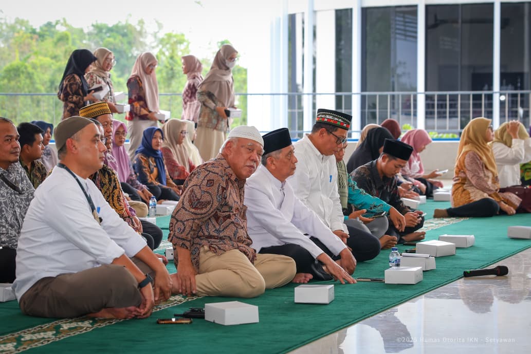 Kepala Otorita IKN, Basuki Hadimujono bersama dengan Ketua MUI Kalimantan Timur dan puluhan jamaah mengikuti acara peringatan Maulid Nabi Muhammad SAW 1447 H di Masjid Balai Kota Otorita IKN. (FOTO: Humas IKN)
