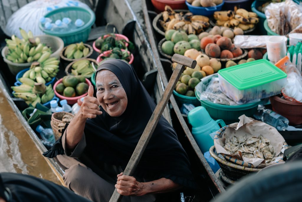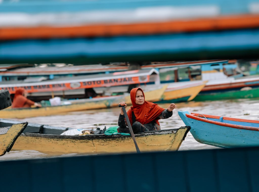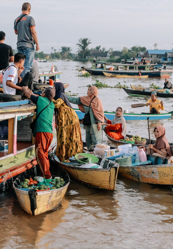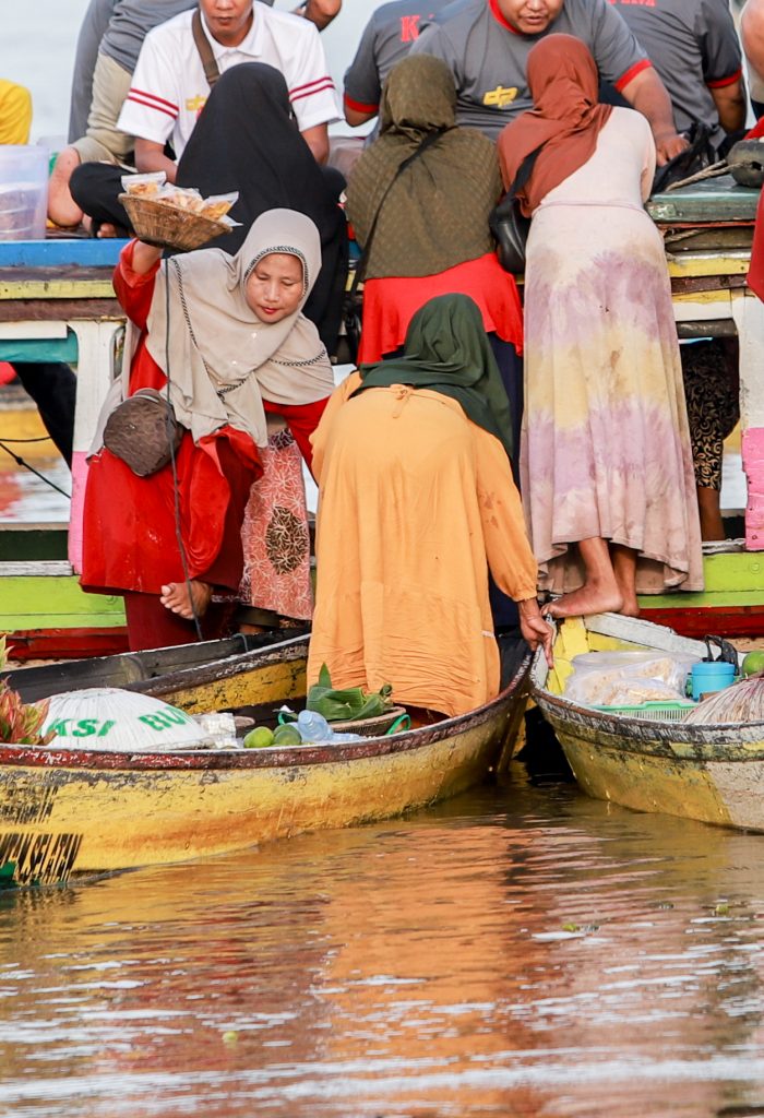 Para pedagang acil-acil tampak menjajakan dagangannya di atas perahu kecil yang bergoyang-goyang, Kamis (18/4) pagi di Pasar Terapung Lok Baintan, Kecamatan Sungai Tabuk, Kabupaten Banjar, Kalimantan Selatan. Tidak tergambar wajah kelelahan, mengeluh atau takut menghadapi hidup. Di atas air mereka berjibaku dengan semangat untuk memenuhi kebutuhan keluarga mereka.