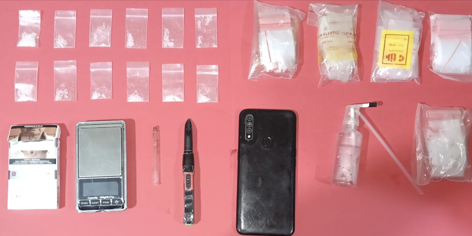 Dari hasil penggeledahan, polisi menemukan 12 bungkus plastik bening berisi kristal putih yang diduga sabu dengan berat bruto 5,55 gram. Selain itu, turut diamankan lima plastik kosong, satu unit timbangan digital, alat hisap, pipet kaca, sedotan runcing, kotak rokok, serta satu unit handphone yang diduga digunakan sebagai sarana transaksi.