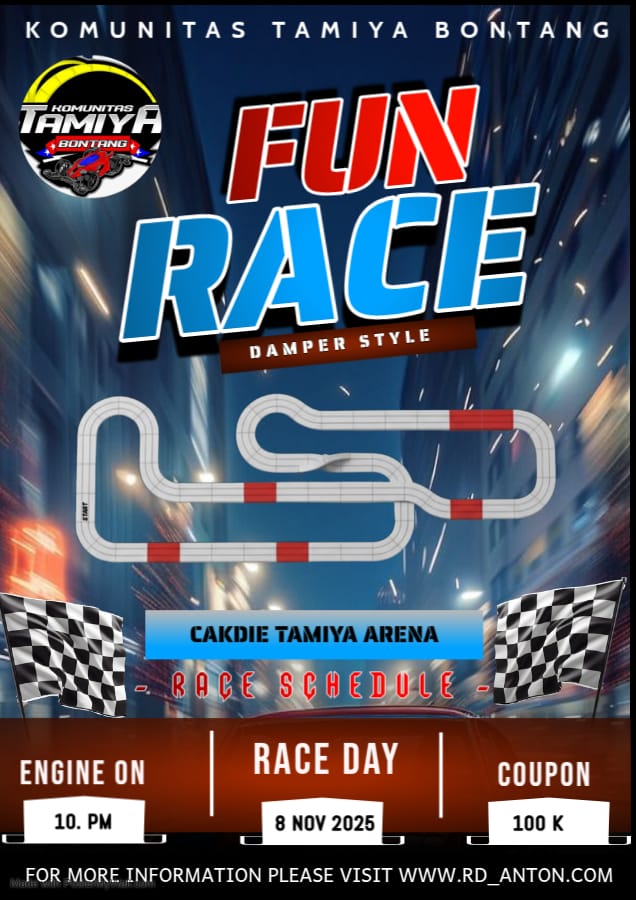 BONTANG. Buat kamu para pecinta mobil mini 4WD, saatnya unjuk kemampuan dan keseruan di ajang Fun Race Damper Style yang digelar oleh Komunitas Tamiya Bontang (KTB). Event seru ini akan berlangsung pada Jumat (8/11/2025), mulai pukul 10.00 WITA di Cakdie Tamiya Arena yang beralamat di Jl. Mutira, RT.8, No.24, Kampung baru, Bontang Selatan.