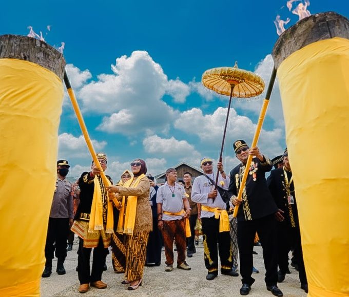Wali Kota Bontang Neni Moerniaeni menyalakan obor sakral pada pembukaan Festival budaya Erau Pelas Benua Guntung 2025 (FOTO: KMF-Adiepraja) BONTANG. Festival budaya Erau...