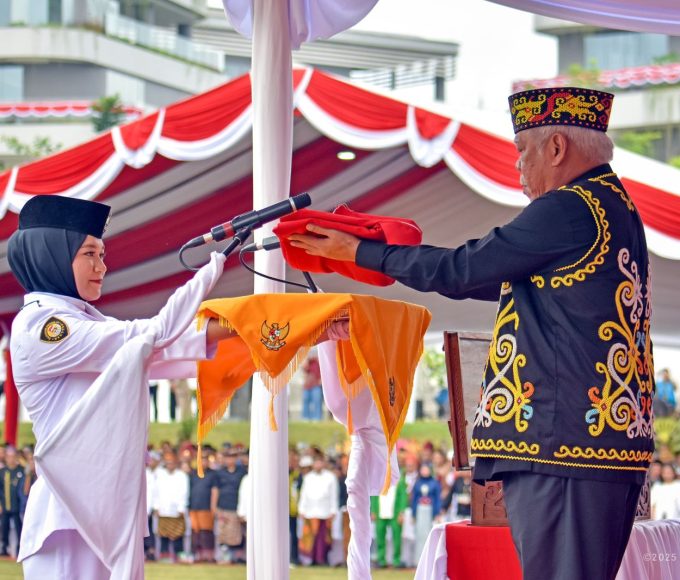 Dr. (H.C.) Ir. H. M. Basuki Hadimuljono, M.Sc., Ph.D., selaku inspektur upacara menyerahkan bendera Merah Putih kepada pembawa baki, Aulia Novita, siswi SMAN...