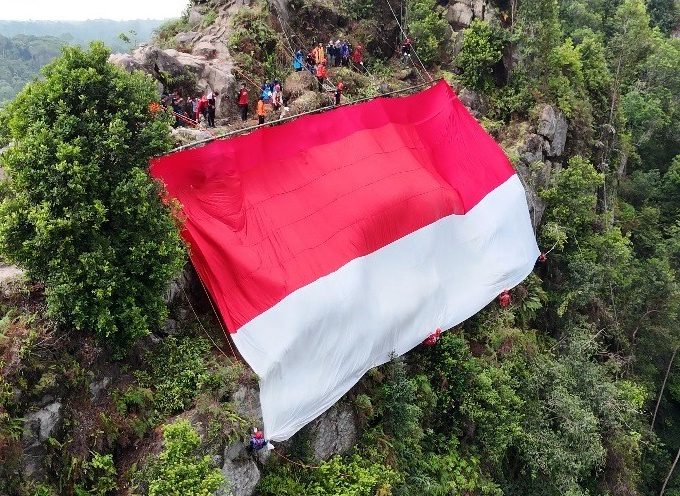 Pengibaran bendera Merah Putih raksasa berukuran 25 x 15 meter di tebing Batu Dinding, Samboja Barat, Kukar, Minggu (17/8/2025). (FOTO: Dok. Komunitas Kolaborasi...