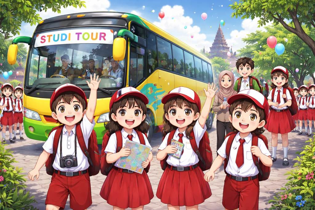 Ilustrasi anak sekolah sedang melaksanakan study tour. (FOTO: AI Generated)