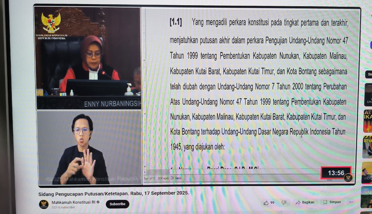 SANGATTA. Mahkamah Konstitusi (MK) akhirnya menutup babak panjang sengketa status administratif Kampung Sidrap di Desa Martadinata, Kecamatan Teluk Pandan, di Kabupaten Kutai Timur (Kutim). Dalam sidang putusan uji materi Undang-Undang Nomor 47 Tahun 1999 yang digelar daring pada Rabu (17/9/2025), MK menolak seluruh permohonan Pemerintah Kota Bontang. Putusan ini memastikan Sidrap tetap berada di bawah Kabupaten Kutim.